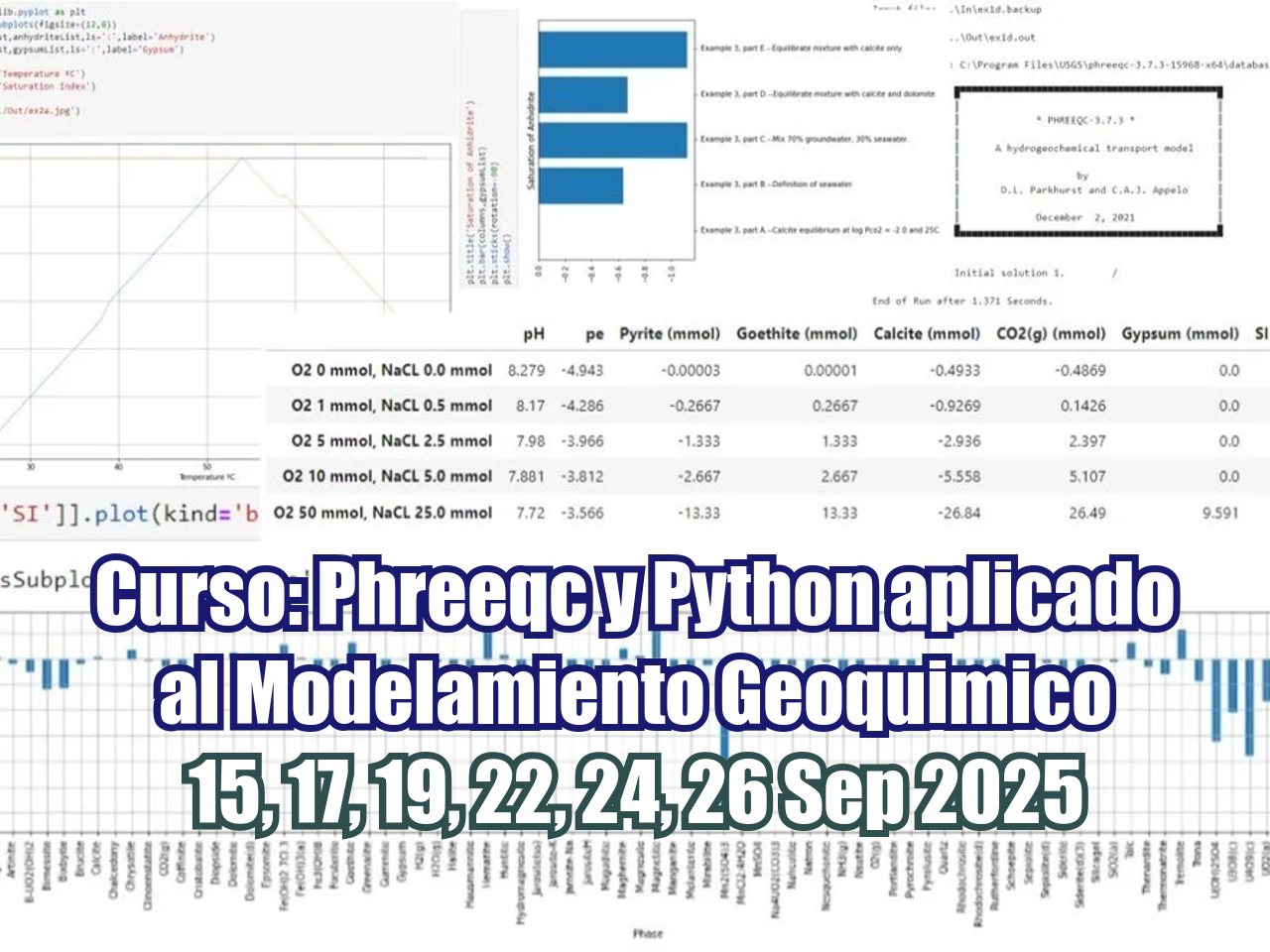 Gidahatari ha desarrollado un curso único y aplicado a Phreeqc integrado con Python bajo una clase (tipo de objeto) que puede ejecutar, analizar y proporcionar resultados de Phreeqc como dataframes de Pandas e integrarlos en gráficos y análisis adicionales con otras librerías de Python en Jupyter Notebook.