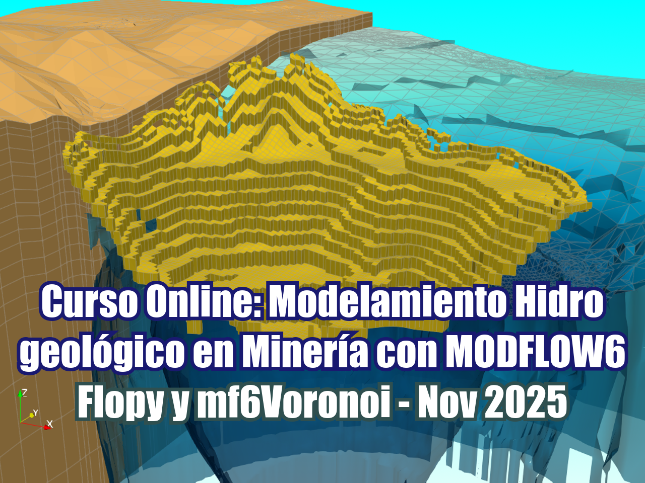 Este curso cubre el uso de MODFLOW6 con Flopy y mf6Voronoi para el modelado numérico del impacto del flujo de aguas subterráneas derivado del desarrollo de tajos, minas subterráneas y flujo de infiltración desde depósitos de minerales y relaveras.