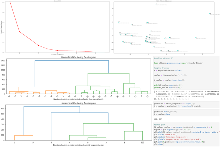 Hay varias formas de analizar la correlación entre los componentes químicos, sin embargo, los métodos para agrupar muestras de agua para analizar su fuente, grado de contaminación o reacciones químicas no están bien desarrollados o no están bien estandarizados. Hemos desarrollado un caso aplicado de Análisis de Componentes Principales (ACP) para muestras de agua del conjunto de datos utilizado para identificar las causas de la alta concentración de uranio en el Valle de San Joaquín, California, EE. UU. Este tutorial cubre todos los pasos involucrados en el análisis de ACP con Python en Jupyter notebook junto con un análisis de agrupamiento aglomerativo, también abarca el analisis de comparación de muestras relacionadas en un dendograma con su posición en una gráfica de ACP.