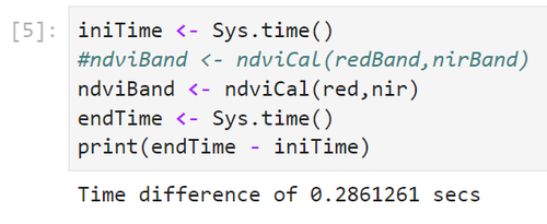 El álgebra ráster entre dos bandas Landsat tomó 0.28 seg en R, mientras que en Python tomó 0.1 seg. A partir de esas veces, el script de Python es casi 3 veces más rápido que R en esa parte del cálculo.