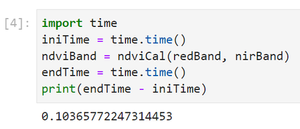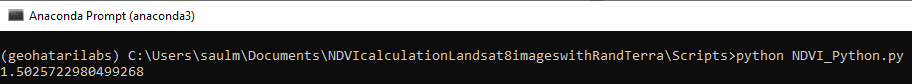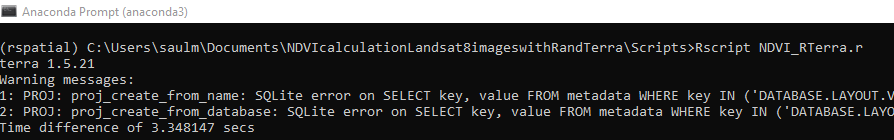 Ambos scripts se lanzaron en un terminal Anaconda con diferentes entornos conda para Python y R. El propósito de esta comparación fue medir el tiempo de todo el procesamiento ráster que incluye la carga ráster, el cálculo NDVI como función y como guardar el ráster geoespacial. El código R tiene algunas advertencias que podrían venir con algunas incompatibilidades de Conda.