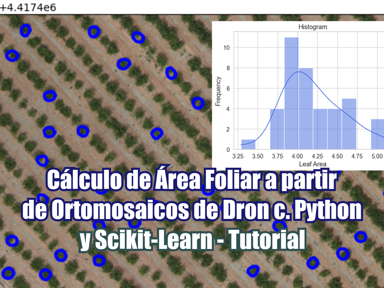 Además de contar cultivos, también podemos delinear plantas y calcular su área foliar utilizando métodos que ajustan splines abiertos o cerrados a líneas o bordes en una imagen. Estos métodos están implementados en la biblioteca de Python Scikit-Image y se aplican para la delineación de copas de árboles sobre una imagen ráster geoespacial. El ejercicio se desarrolla en un Jupyter Notebook y cubre todos los pasos: desde la importación de la imagen, aplicación de escala de grises, exploración del filtro gaussiano, cálculo de contornos activos y exportación de polígonos como shapefile de ESRI. Finalmente, se genera un histograma para determinar la distribución del área foliar de las plantas.