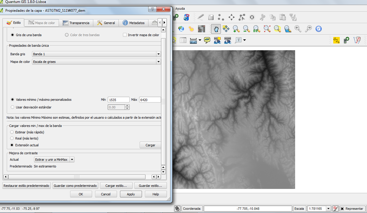 Para recortar el raster en nuestra zona de interés se superponen el DEM, las ubicaciones de los puntos de muestreo de la cuenca, ubicaciones de los ríos y lagos de la zona. Para poder definir bien el área de interés se debe cargar los valores máximos y mínimos, así como mejorar el contraste del DEM.