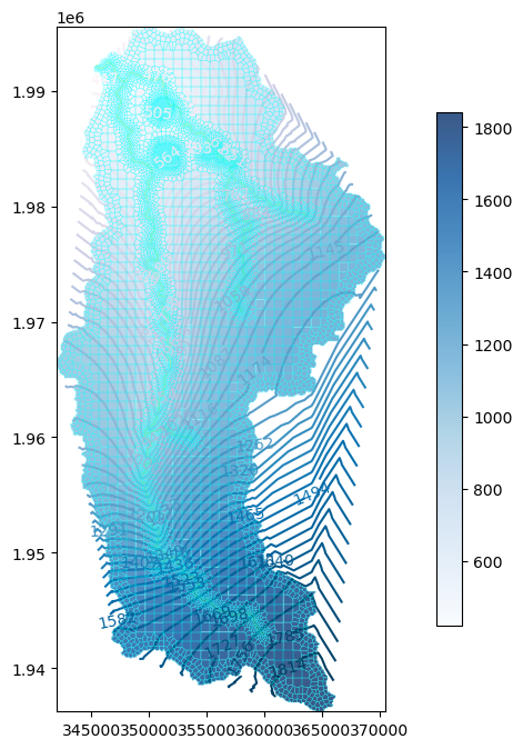 cellhead = modelmap.plot_array(heads[3],ax=ax, cmap='Blues', alpha=0.8) ## Org