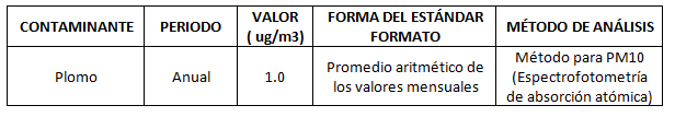 El valor anual de concentración de plomo, expresado en microgramos por metro cúbico (ug/m3), quedando el estándar para este contaminante en la forma siguiente: