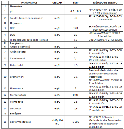 Para mayor detalle sobre los métodos a utilizarse en medición de residuos sólidos de efluentes se encuentra en el Anexo 3 (DECRETO SUPREMO N°001 - 2009- MINAM).