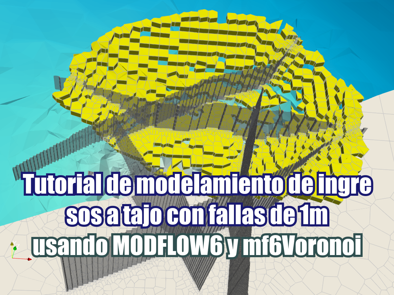 Ejemplo aplicado de la simulación del flujo de agua subterránea hacia una mina a cielo abierto considerando fallas con un espesor de 1 metro. El modelo tiene 6 períodos de esfuerzo, uno de estado estacionario y 5 períodos transitorios que representan el desarrollo de la mina a lo largo de 4 años dentro de una vida total de la mina de 20 años. El tutorial muestra el proceso completo comenzando desde la creación de la malla, construcción del modelo, análisis del balance hídrico y representación tridimensional.