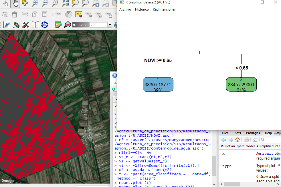 En este tutorial se muestra cómo realizar un árbol de clasificación en R utilizando 3 rásters. Uno de los rásters incluye dos clases: alto y bajo rendimiento en un área agrícola. Las variables del cultivo a estudiar son el Índice de Vegetación Diferencial Normalizado (NDVI) y el contenido de agua en los cultivos. Los 3 rásters son procesados en R para identificar las reglas que el árbol de clasificación indique. En éste caso, el árbol de clasificación identificó que las áreas con un NDVI mayor a 0.65 corresponden con las áreas de mayor rendimiento y las de menor rendimiento corresponden con las que son menores a este valor.