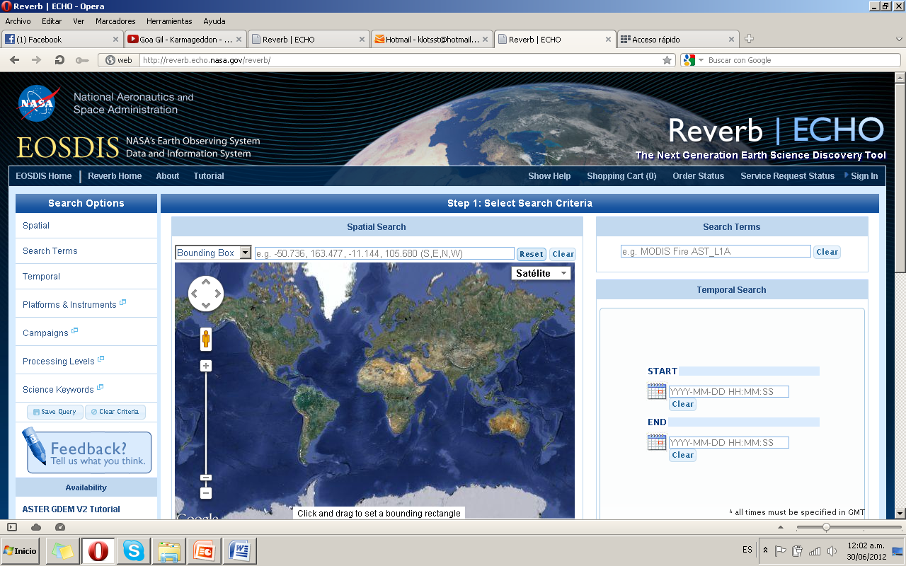 Una vez iniciada la sesión, se procede a ubicar el área de interés sobre el que se desea obtener información, para este ejemplo se seleccionó una zona en México sobre el mapa que muestra la pantalla de la página principal, sólo basta marcar un cuadrado sobre el sitio elegido. En este ejemplo, en la zona de búsqueda de términos ingresamos MODIS (Moderate Resolution Imaging Spectroradiometer), es un instrumento que se encuentra en los satélites Terra (EOS AM) y Aqua (EOS PM).